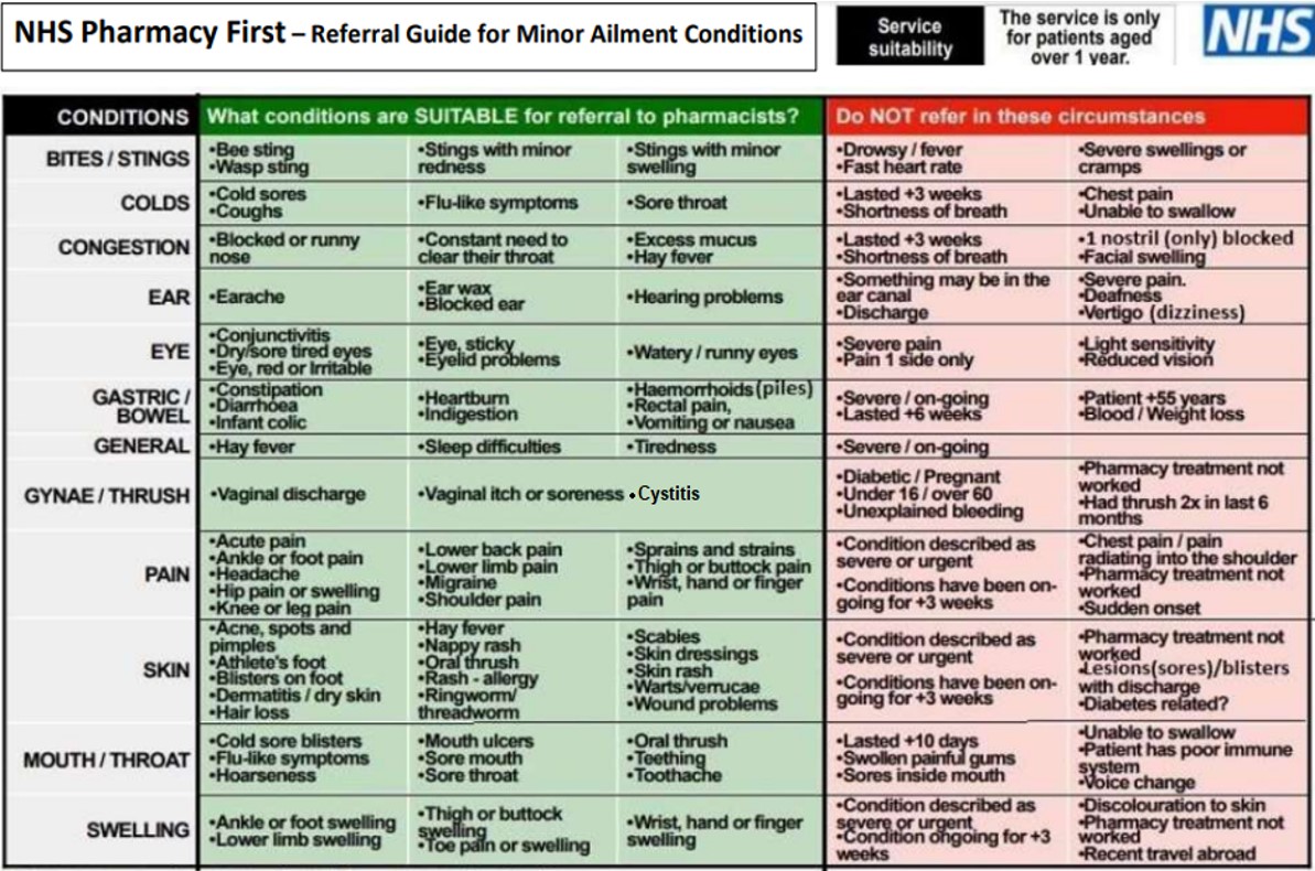 The colour-coded Referral Guidance Tool provides helpful decision support for receptionists setting out what can be referred, and what ought not to be referred into the Pharmacy First service. There are around seventy commonly mentioned symptoms listed in the ‘green’ minor ailments section of the Guidance Tool all of which can be referred to pharmacists in the NHS Pharmacy First Service.